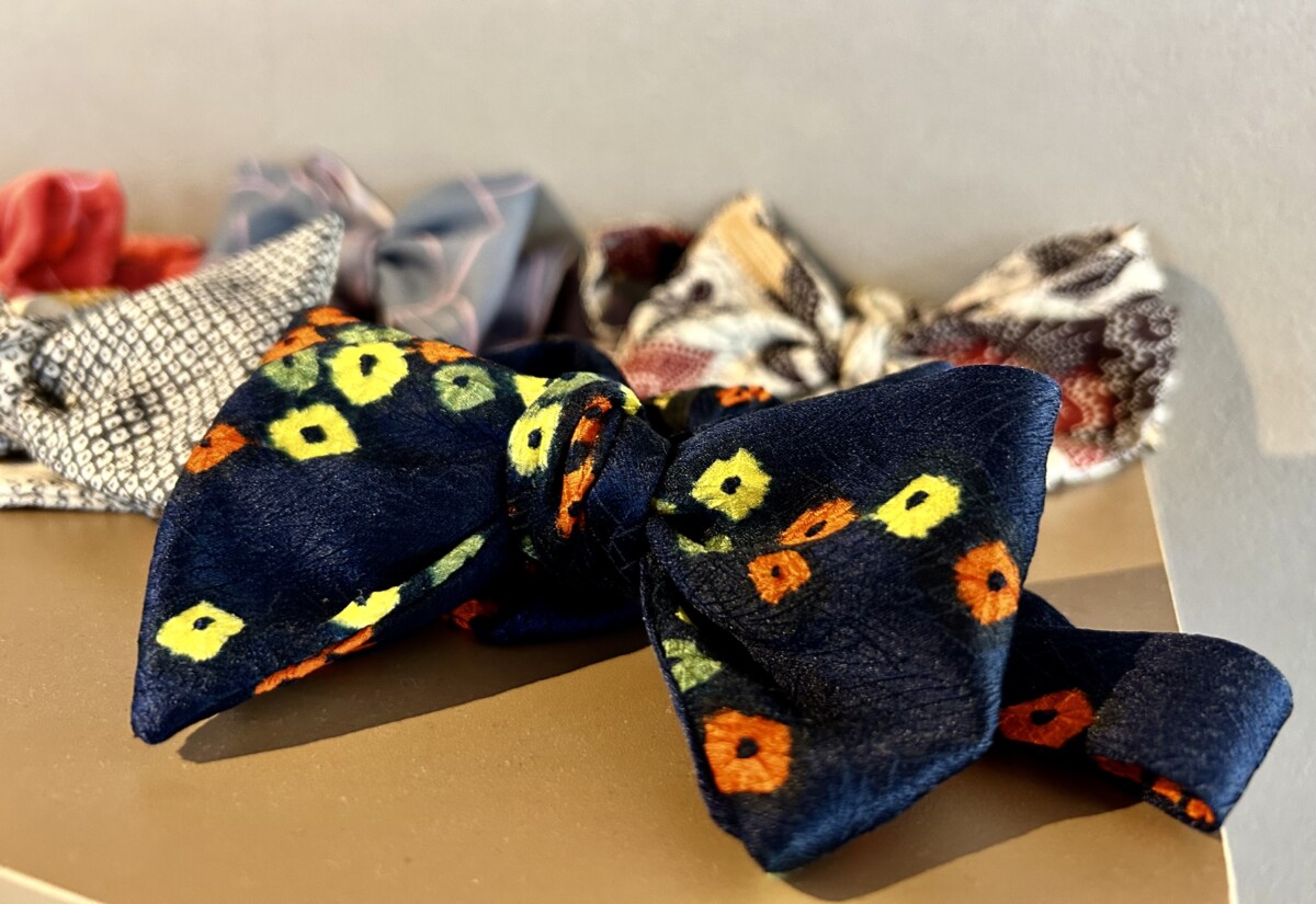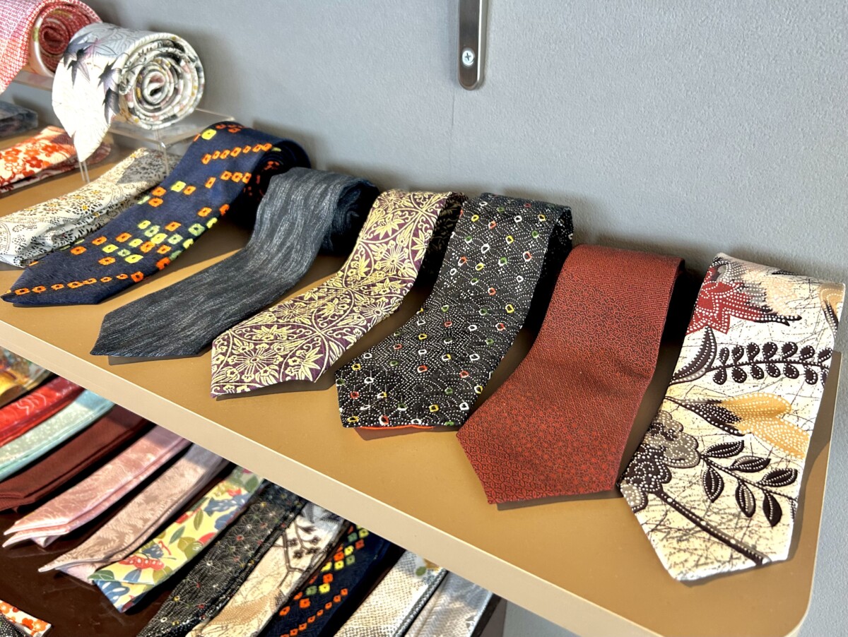 正絹などかなりいいものが入ってたにもかかわらず、店を閉めるので必要がなくなったからと、かなりの枚数をまとめて5000円で購入。とりあえずトロントに運び、ネクタイにしてみるのはどうだろう、と思いつきます。たまたま自分の好きなネクタイのメーカーブランドが、当時住んでたマンションから徒歩30分のところにあり、さっそく連絡してみました。「着物でネクタイ作れませんか」、と依頼し試作してもらうことになります。