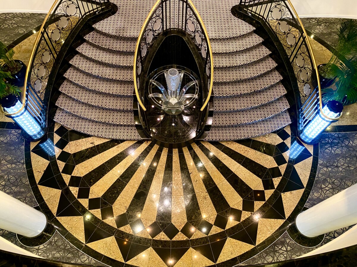 ピカソの絵をはじめ数多くのアートに彩られた船内を進むと、ラリック社のクリスタルをふんだんに使用した煌びやかな大階段が迎えてくれる。チェックインカウンターで部屋のカードキーを受け取り扉を開くと、すでに荷物は届いており、中に足を踏み入れるとテラスからは青い水平線が見える。これから始まる10日間の優雅な航海に想いを馳せる。