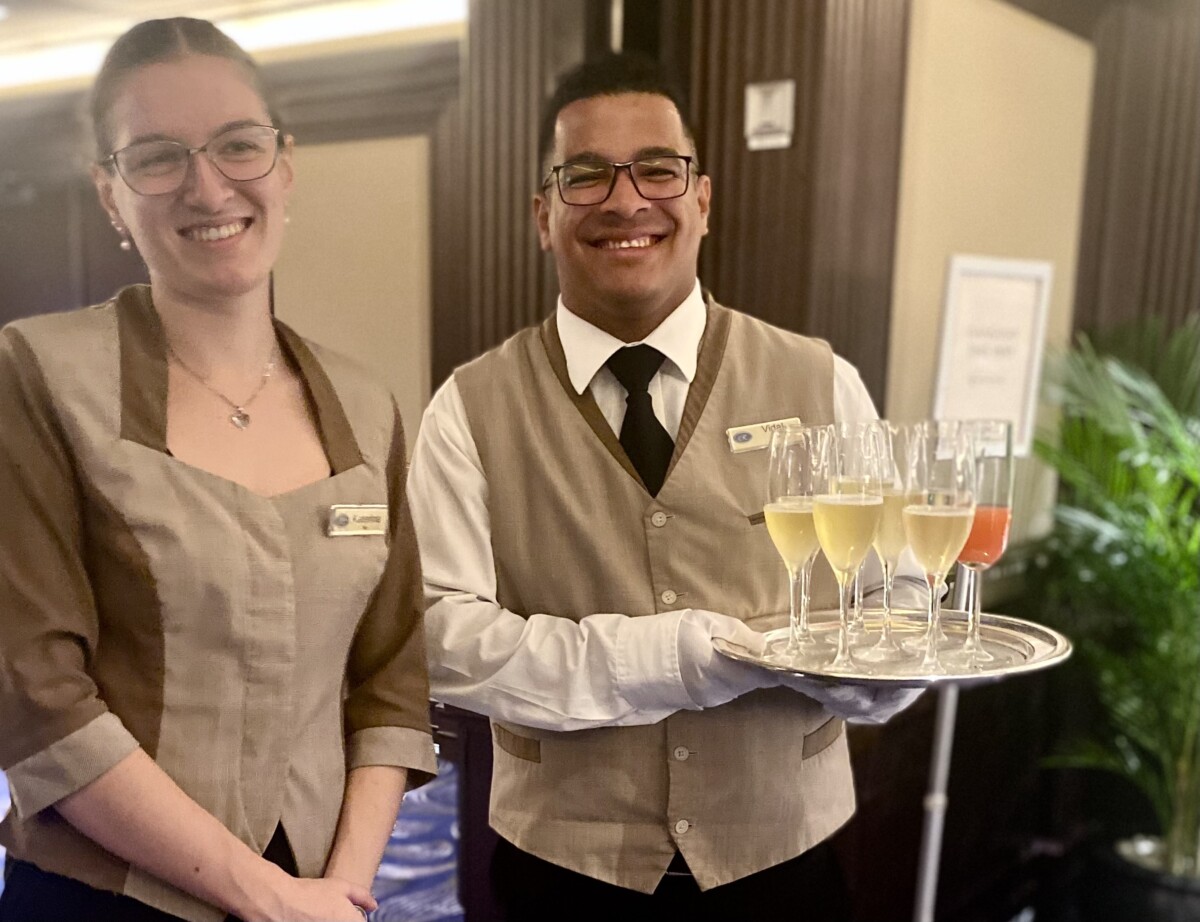 シンガポールのクルーズターミナルに乗客を待つオーシャニアリビエラの姿が見えると、これから始まる洋上の旅にワクワク感満載。スーツケースを船のスタッフに託し、手ぶらで船内に入れば、並んで歓迎してくれるスタッフの笑顔がうれしい。